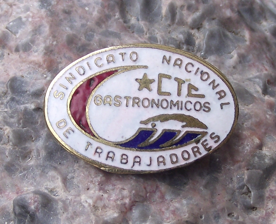 - A pretty gold coloured metal pin badge with a 2.4cm wide badge face and a safety clasp style fastener to the rear. The text reads Sindicato Nacional de Trabajadores CTC Gastronomicos
