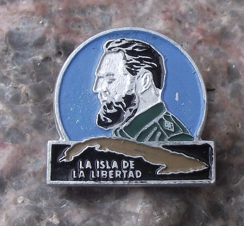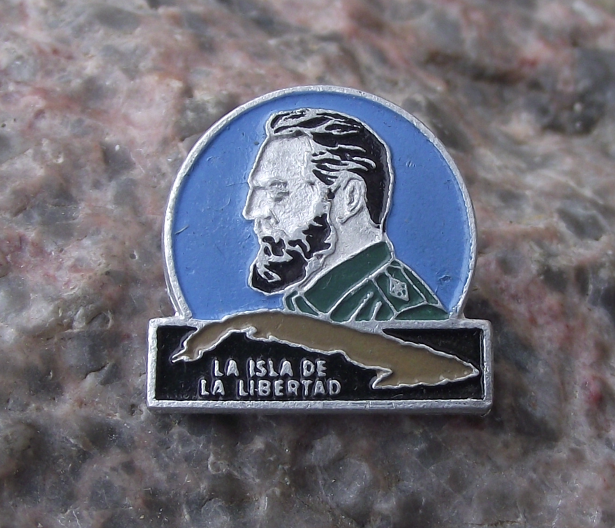- The badge features the outline of Cuba and the text 'Island of the Free' under the image of Fidel Castro.
