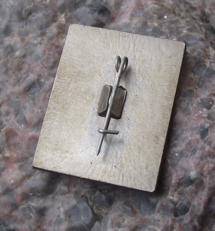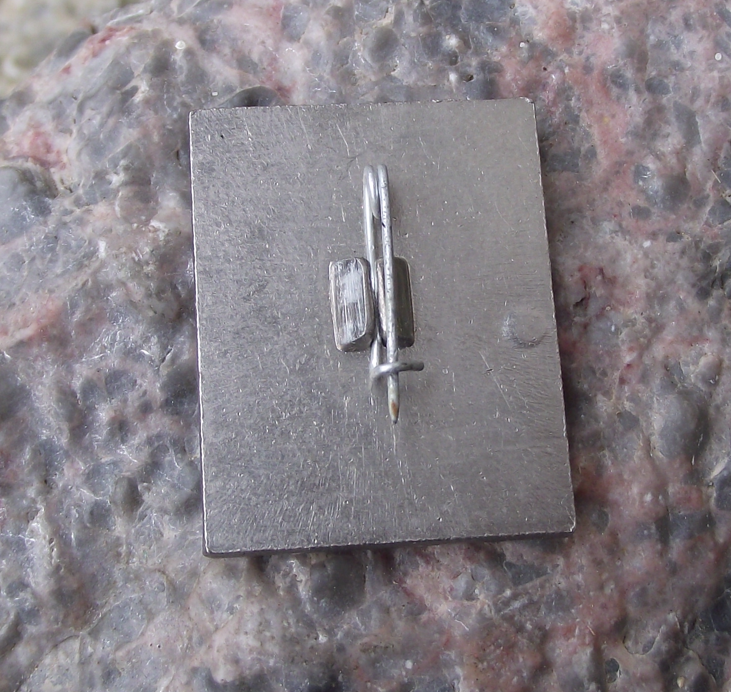 - A pretty silver coloured metal, mirror faced badge with a 2.5cm high badge face and a safety clasp style fastener to the rear.