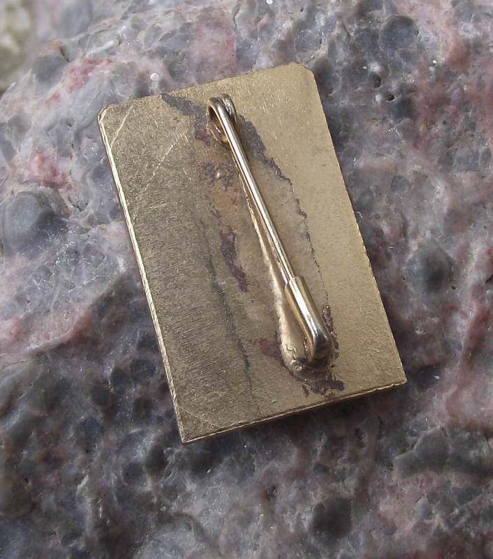 - A pretty gold coloured metal pin badge with a 2.3cm high badge face and a safety clasp style fastener to the rear.