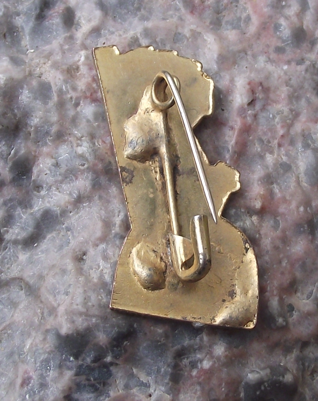 - A pretty gold coloured metal pin badge with a 2.7cm high badge face and a safety clasp style fastener to the rear.