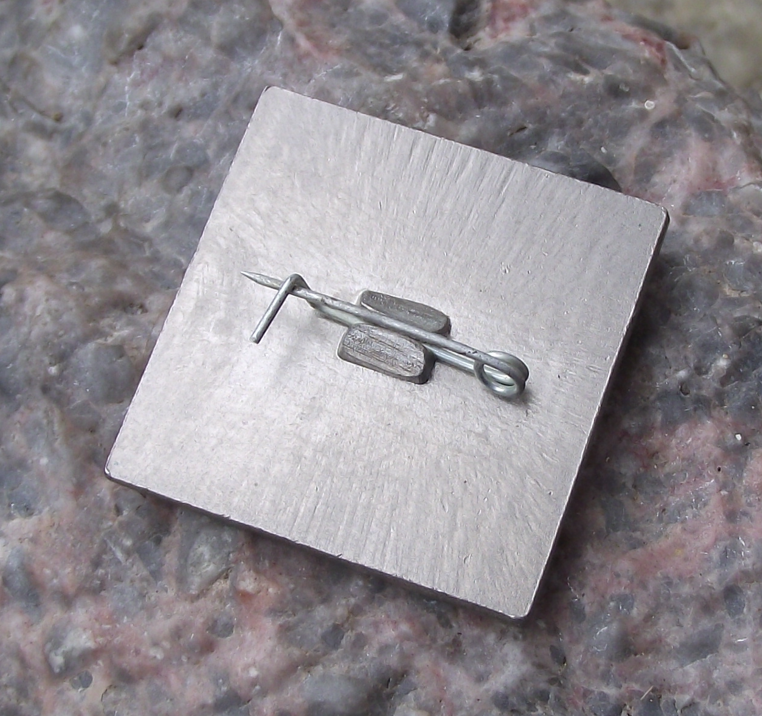 - A pretty silver coloured metal, mirror faced badge with a 2.3cm high badge face and a safety clasp style fastener to the rear.