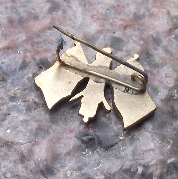 - A pretty, hand painted, gold coloured metal pin badge with a 2cm wide badge face and a safety clasp style fastener to the rear.