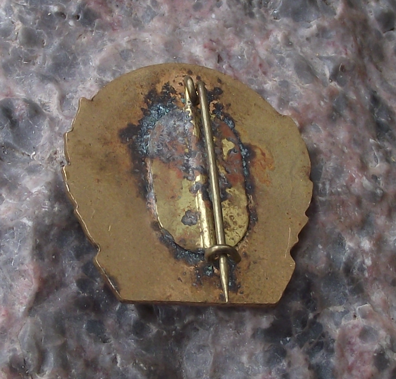 - A pretty gold coloured metal pin badge with a 2.5cm high badge face and a safety clasp style fastener to the rear.