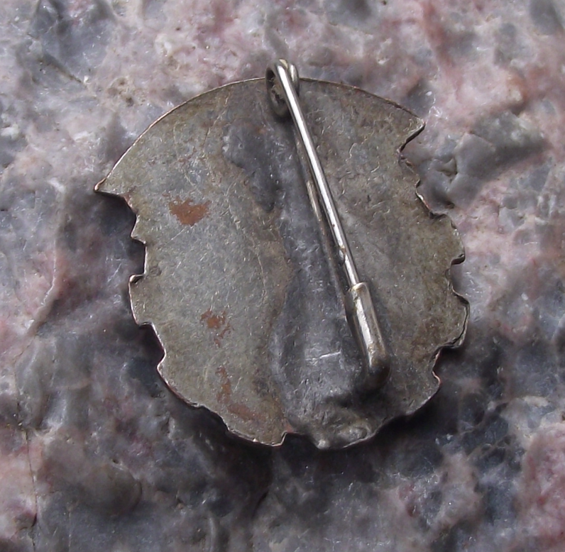 - A pretty, silver coloured metal pin badge with a 2.3cm high badge face and a safety clasp style fastener to the rear.