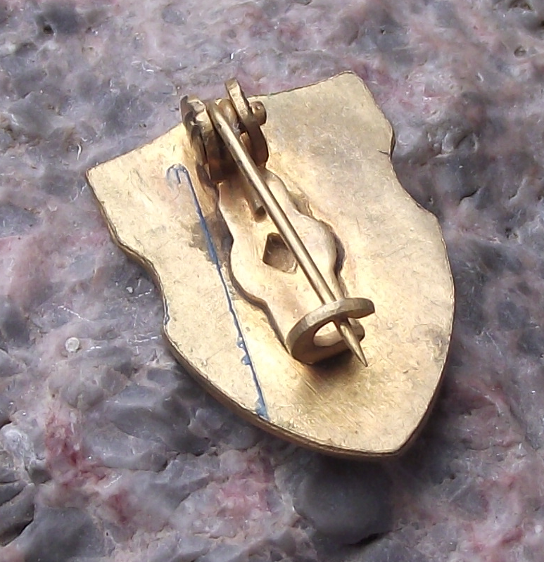 - A pretty gold coloured metal, hand painted pin badge with a 2.1cm high badge face and a safety clasp style fastener to the rear.