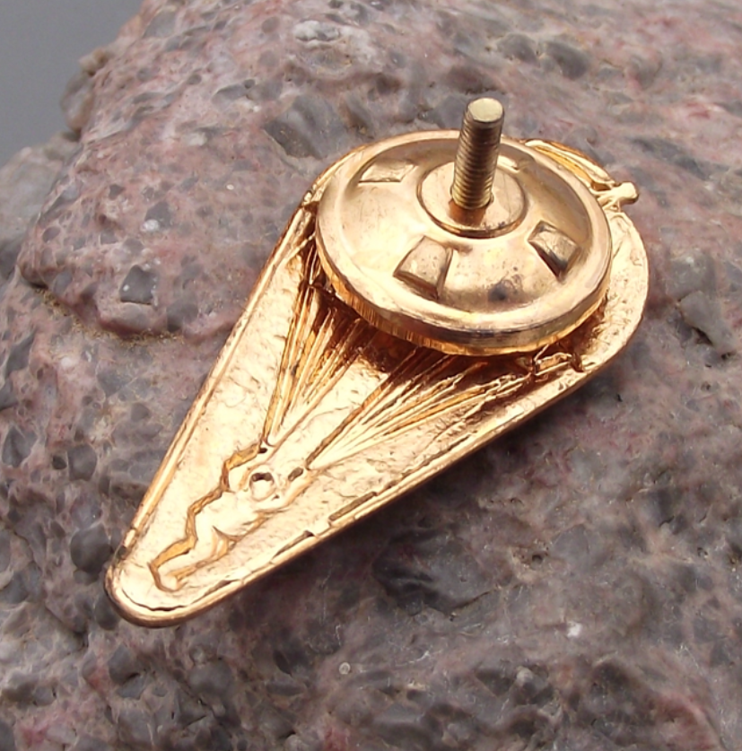 - A large gold coloured metal badge featuring an aircraft and parachutist. The badge face is 4.5cm high and had a uniform screw attachment to the rear.