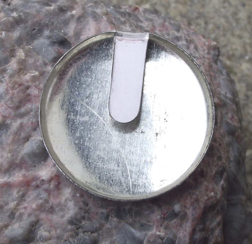 - It is 2.8cm in diameter and has a metal tab to attach it to clothing.
