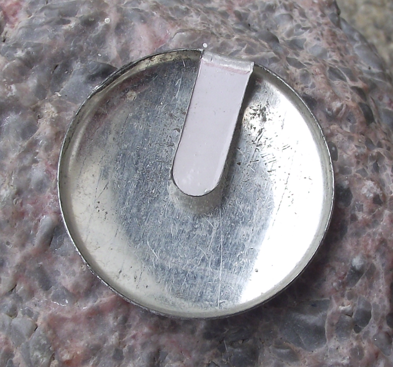 - It is 2.8cm in diameter and has a metal tab to attach it to clothing.