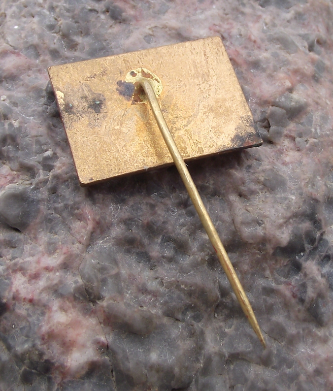 - A vintage gold coloured metal pin badge 2.2cm wide with a long stick pin style fastener to the rear.