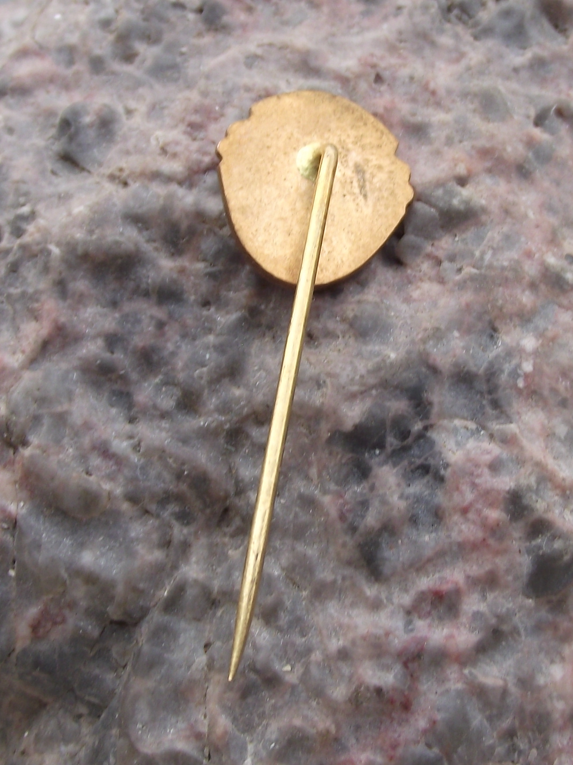 - A gold coloured metal pin badge with a 1.6cm high badge face and a long stick pin style fastener to the rear.