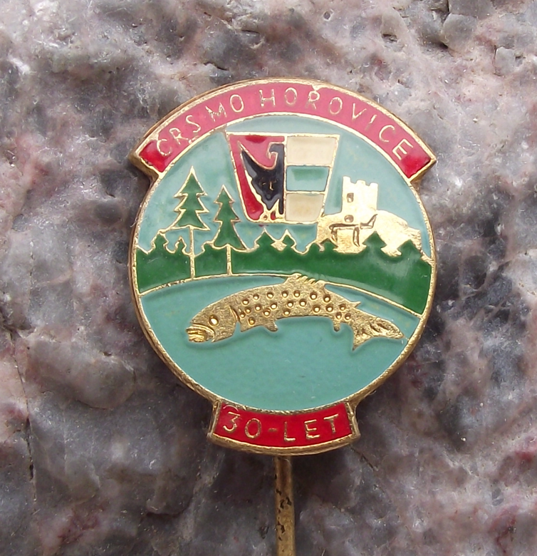 - A pretty, vintage gold coloured metal pin badge from Horovice in former Czechoslovakia. Worn by members of the local fishing association on the 30th anniversary of the club.
