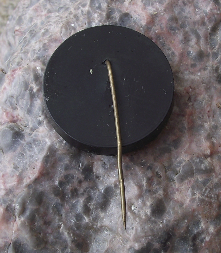 - A 1950's plastic pin badge. The badge face is 2.4cm in diameter and has a long stick pin fastener to the rear.