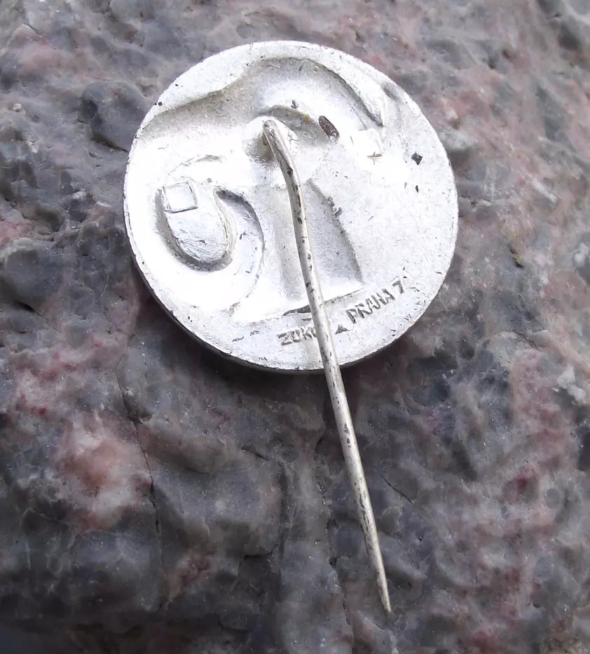 A vintage silver coloured metal hunting themed pin from former Czechoslovakia, the badge face is 2.6cm in diameter and has a long, stick pin style fastener to the rear. Featuring the text '50th anniversary Myslivecky Organisace', it would have been worn by members of the CMS or 'Czechoslovak Hunters Association'.