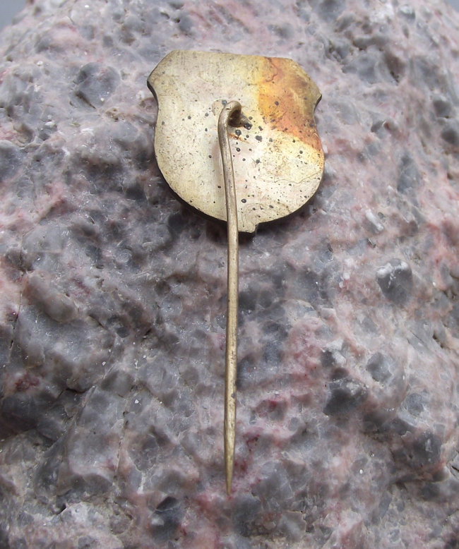 A vintage gold coloured metal hunting themed pin from former Czechoslovakia, the badge face is 2.3cm high and has a long, stick pin style fastener to the rear. Featuring the text 'CMS Vyskov', it would have been worn by members of the CMS or 'Czechoslovak Hunters Association' in the town of Vyskov.