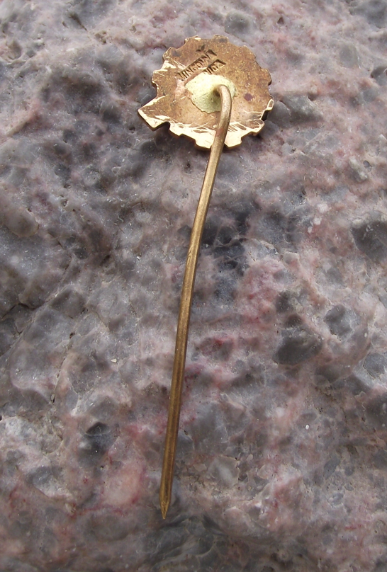 - A gold coloured metal pin badge with a 1.6cm wide badge face and a long stick pin style fastener to the rear.