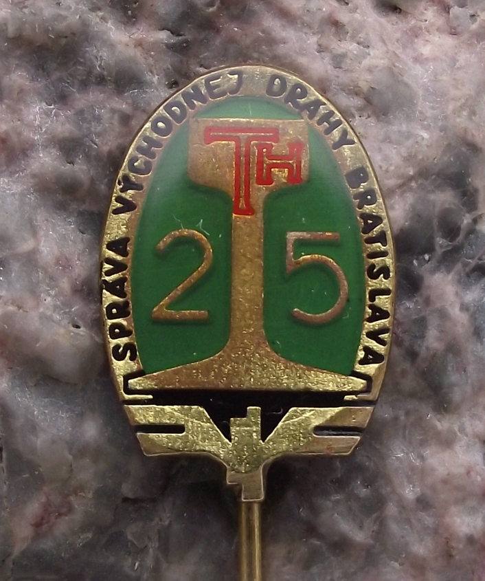 It is a CSD pin advertising the 25th anniversary of the Bratislava Region with a track cross section. The text SPRÁVA VÝCHODNEJ DRÁHY BRATISLAVA translates to BRATISLAVA EASTERN RAILWAY ADMINISTRATION