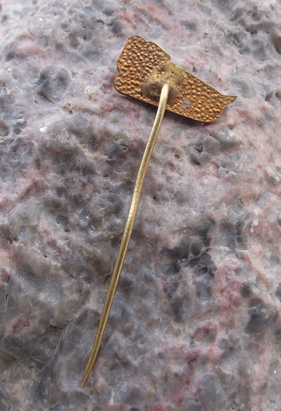 A vintage pin badge from the Czech Railway Company, CSD. The badge face is 2cm wide, made from a gold coloured metal and has a stick pin fastener to the rear.