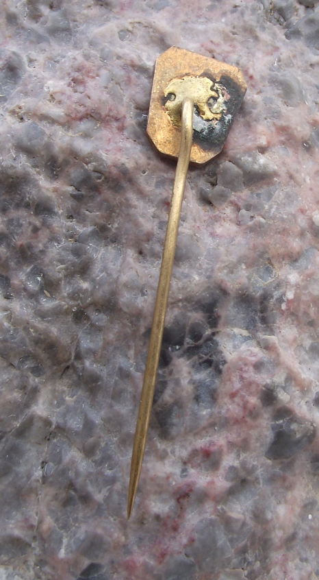 A vintage pin badge from the Czech Railway Company, CSD. The badge face is 1.2cm high, made from a gold coloured metal and has a stick pin fastener to the rear.