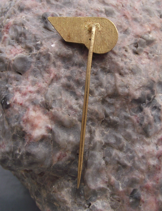 A vintage pin badge from the Czech Railway Company, CSD. The badge face is 2cm wide, made from a gold coloured metal and has a stick pin fastener to the rear.