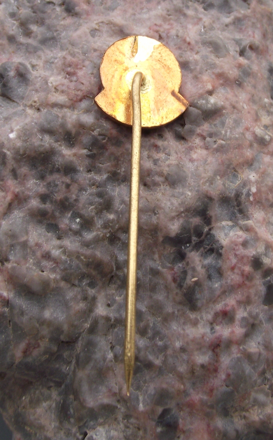A vintage pin badge from the Czech Railway Company, CSD. The badge face is 1.4cm high, made from a gold coloured metal and has a stick pin fastener to the rear.