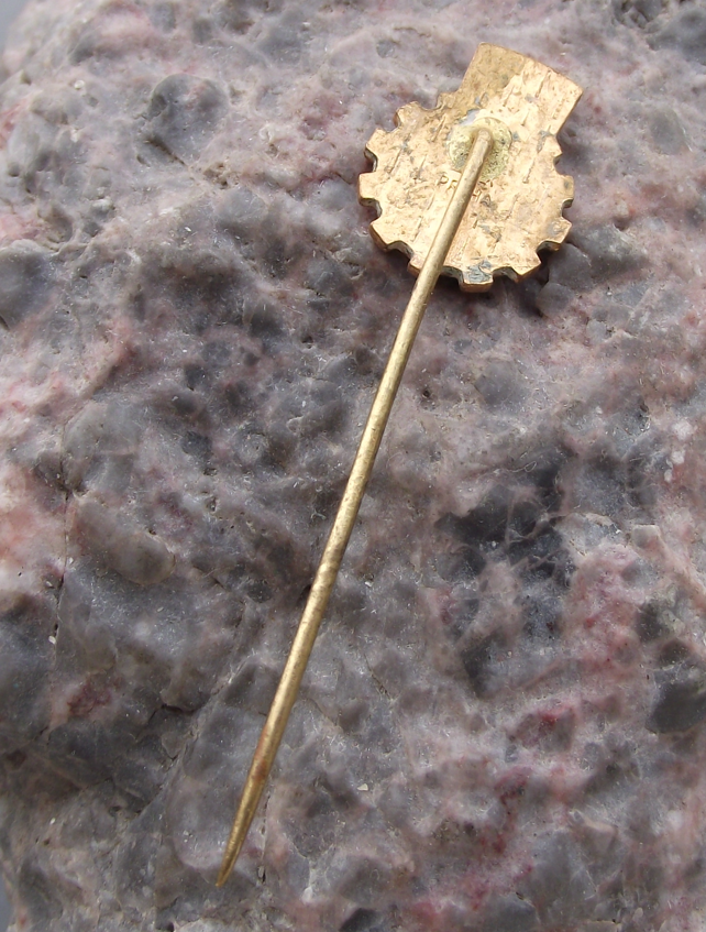 - A gold coloured metal pin badge with a 1.8cm high badge face and a long stick pin style fastener to the rear. This particular pin is from the trade union association of agricultural workers and features a stalk of wheat and machine cog.