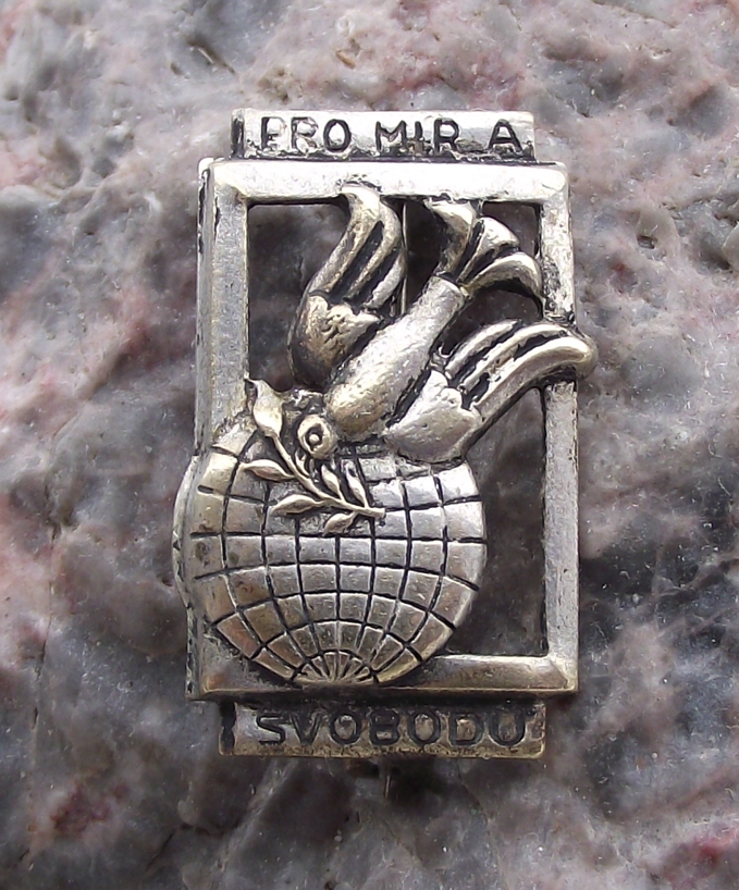 Manufactured in Czechoslovakia, it features a dove with an olive branch in its beak and the text PRO MIR A SVOBODU or 'FOR PEACE AND FREEDOM'