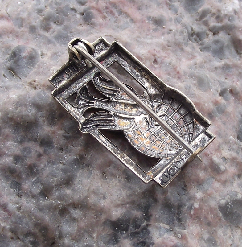 A rare vintage, silver coloured metal pin badge with a 2.5cm high badge face and a safety clasp style fastener to the rear.