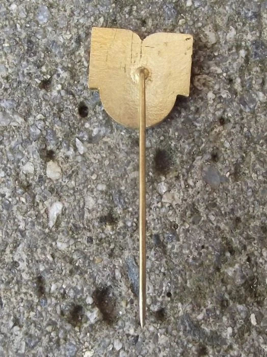 A pretty souvenir pin badge from the Czech Railway Company. The badge face is 1.4cm wide, made from a gold coloured metal and has a stick pin fastener to the rear.