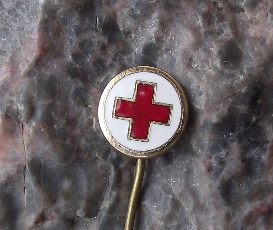 - A silver coloured metal pin badge. Featuring a red cross on a white background. It is an old pin badge dating from the 1960's and from former Czechoslovakia.