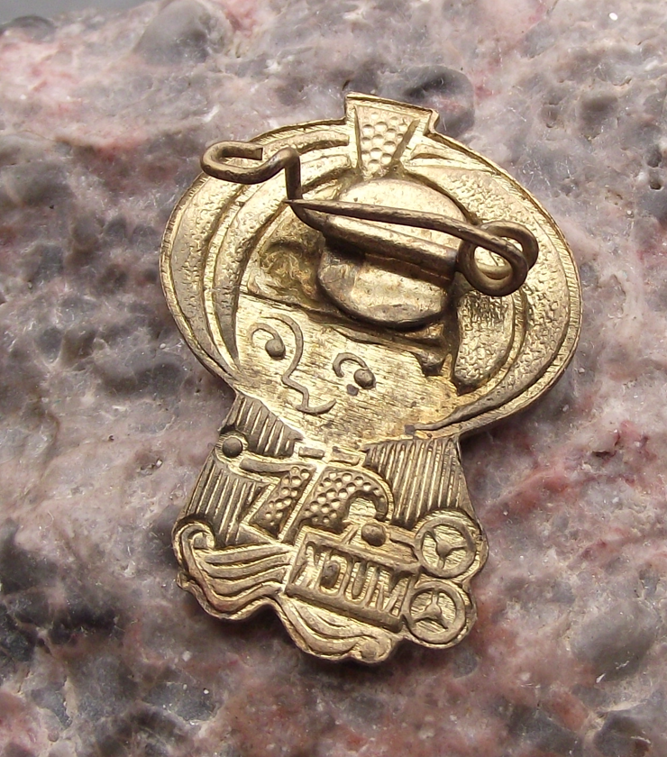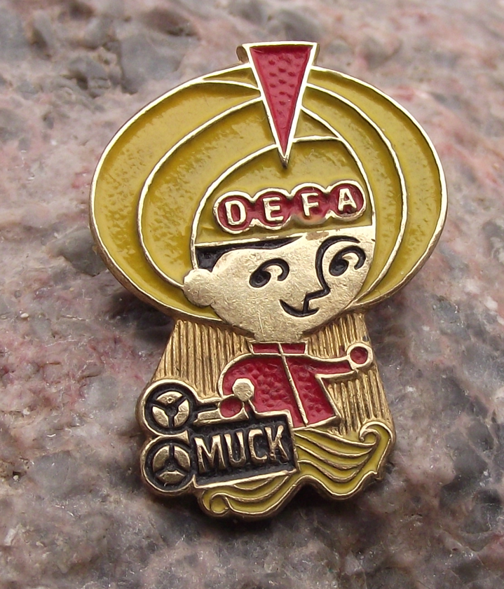 - A pretty, gold coloured metal pin badge from DEFA in former East Germany. The badge face is 3cm high and has a safety clasp style fastener to the rear.