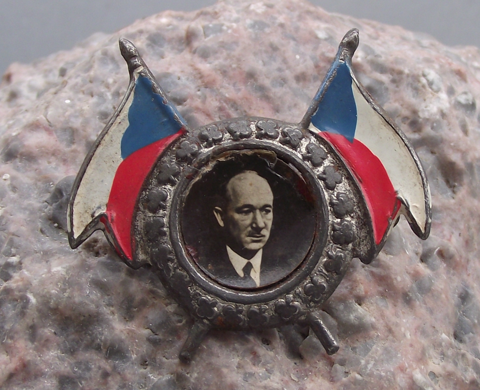 - A vintage silver coloured pressed metal badge 3.5cm wide with a safety clasp style fastener to the rear. Featuring Edward Benes on hand painted crossed Czech flags.