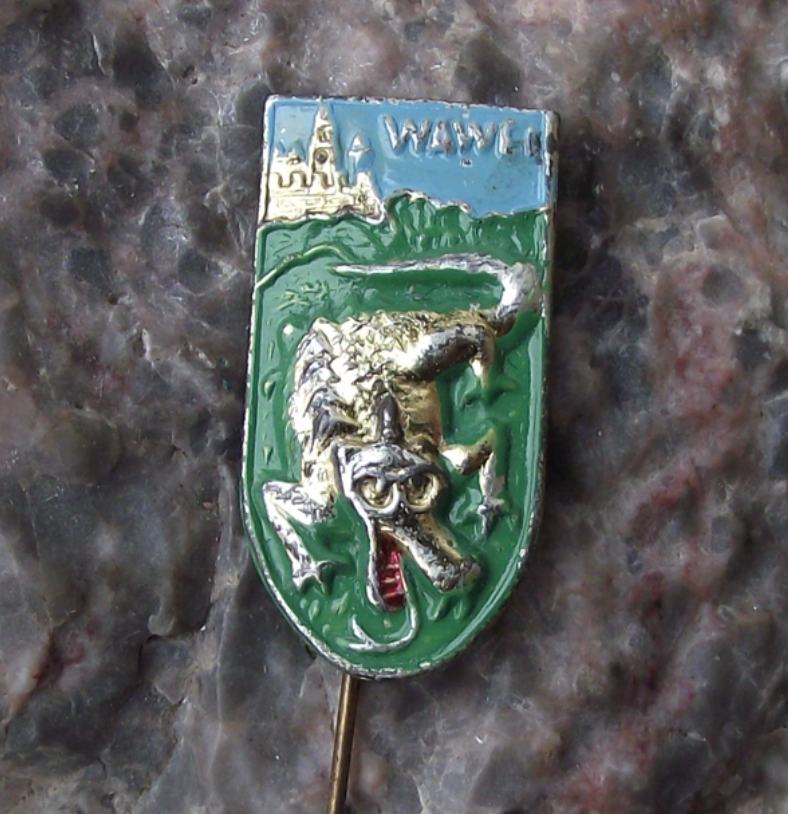 - A very pretty, hand painted, vintage Polish pin badge featuring the Dragon of Wawel Hill. It is made from a gold coloured pressed metal. The badge face is 2.3cm high and has a short, stick pin fastener to the rear.