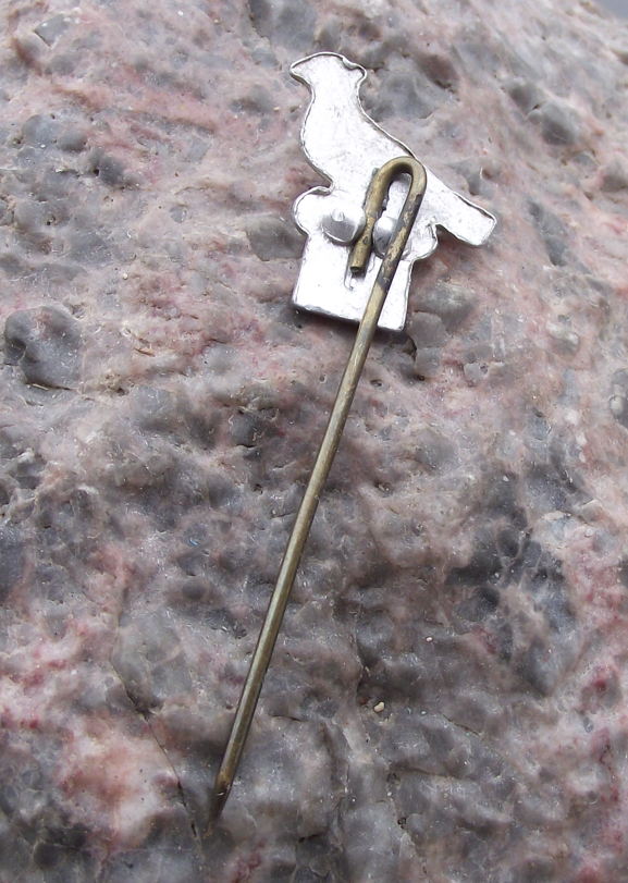 A rare vintage, silver coloured metal pin badge with a 2cm high badge face and a long stick pin style fastener to the rear.