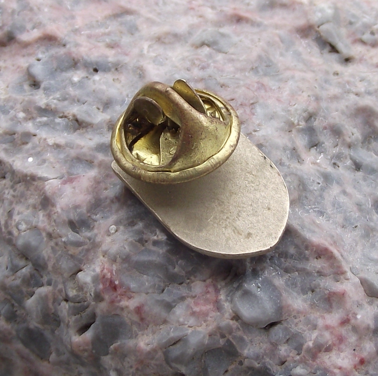- A vintage gold coloured metal pin badge 1.8cm high with a butterfly clasp style fastener to the rear.