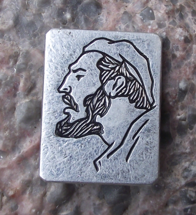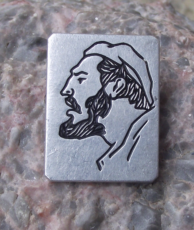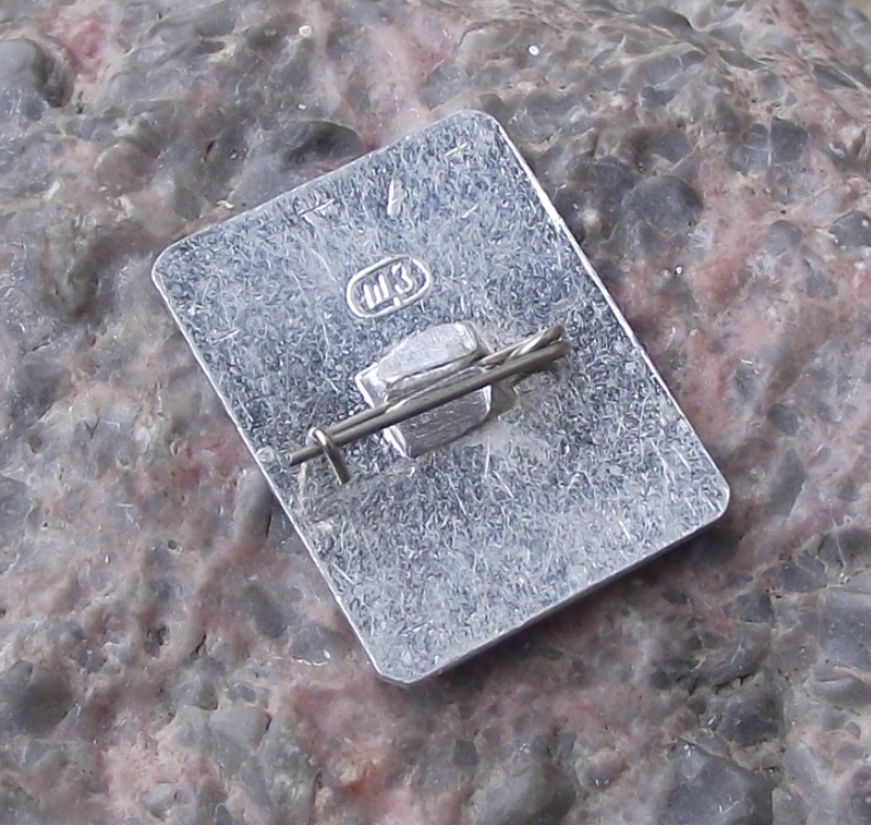 A pretty silver coloured metal pin badge with a 2.2cm high badge face and a safety clasp style fastener to the rear.