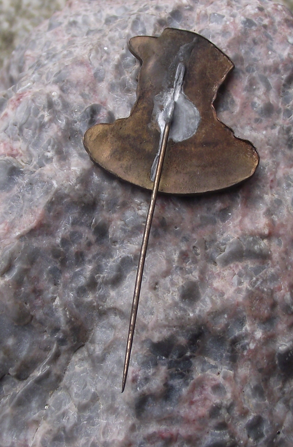 - A pretty, hand painted gold coloured metal pin badge with a 2.8cm high badge face and a long stick pin style fastener to the rear.