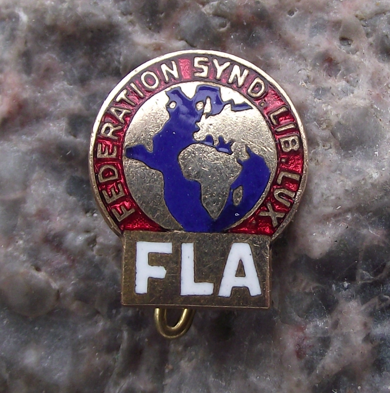 - The text on the badge face reads 'FLA Federation Sydicale Lib Lux' and is from the Luxembourg Workers' General Union and part of the FSM