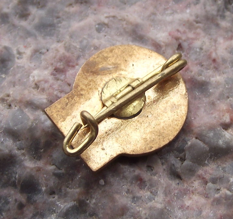 - A gold coloured metal pin badge with a 1.7cm high badge face and a safety clasp style fastener to the rear.