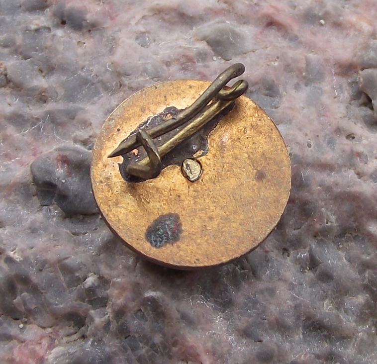 - A gold coloured metal pin badge 1.5cm in diameter with a safety clasp style fastener to the rear.
