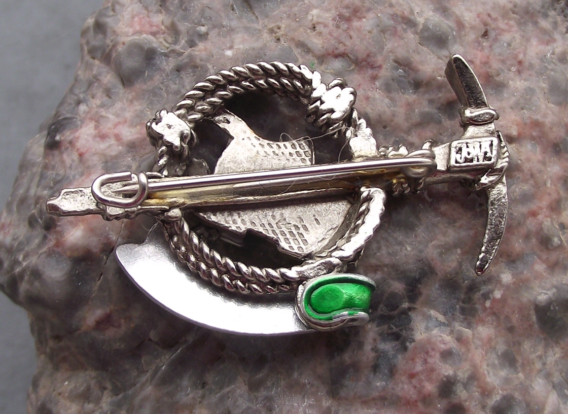 - A vintage silver coloured metal climbing themed pin from Austria, the badge face is 4.2cm wide and has a safety clasp style fastener to the rear. Featuring a golden boot, rope and axe and the text Grossglockner 3798m
