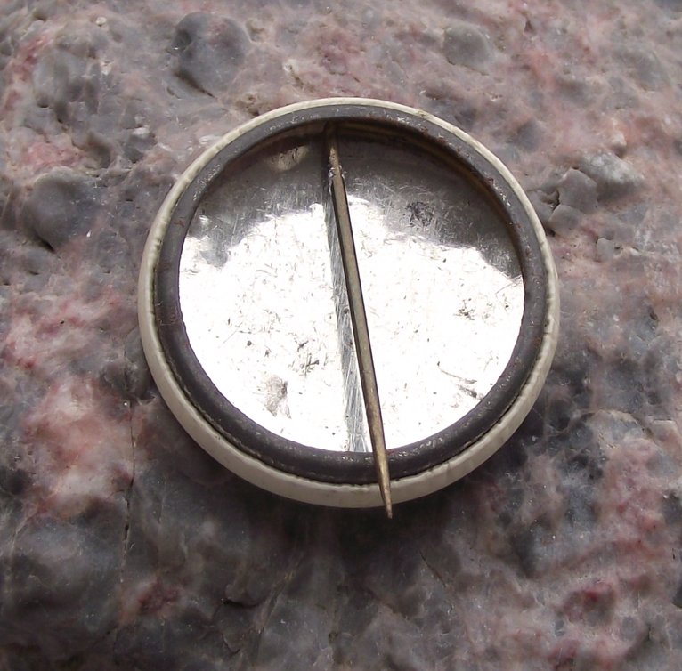 - A vintage metal badge 2.6cm in diameter with a short stick pin style fastener to the rear.