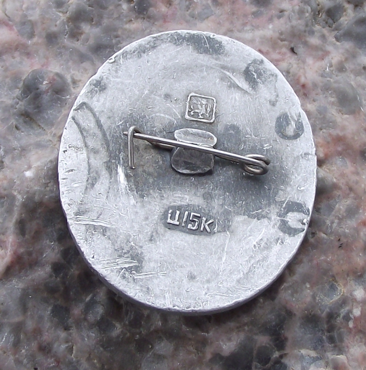 - A silver coloured metal badge with a 3cm high face and a safety clasp style fastener to the rear.