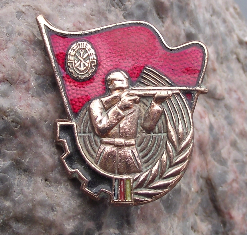 - An pretty pin badge made from a gold coloured metal. The badge face is 2.8cm high and has a safety clasp style fastener to the rear. Featuring the crossed rifle, anchor and propeller symbols logo of GST Gesellschaft für Sport und Technik and Featuring a man firing a rifle.