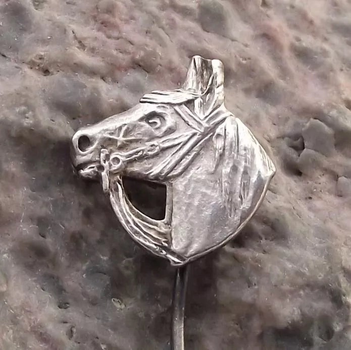 The badge face is 1.5cm high and has a long, stick pin style fastener to the rear. The badge features a racing horse head.