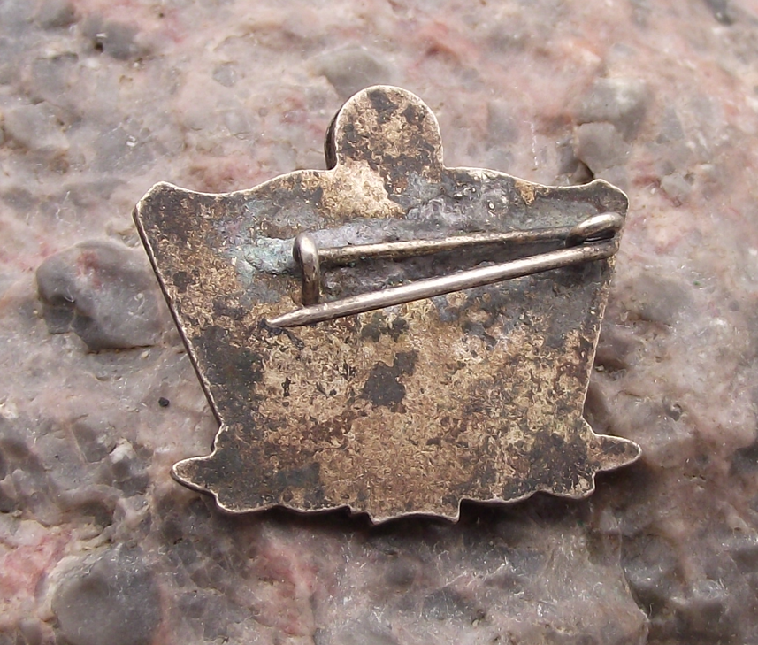 - A silver metal pin badge 2.3cm in diameter with a safety clasp style pin fastener to the rear.