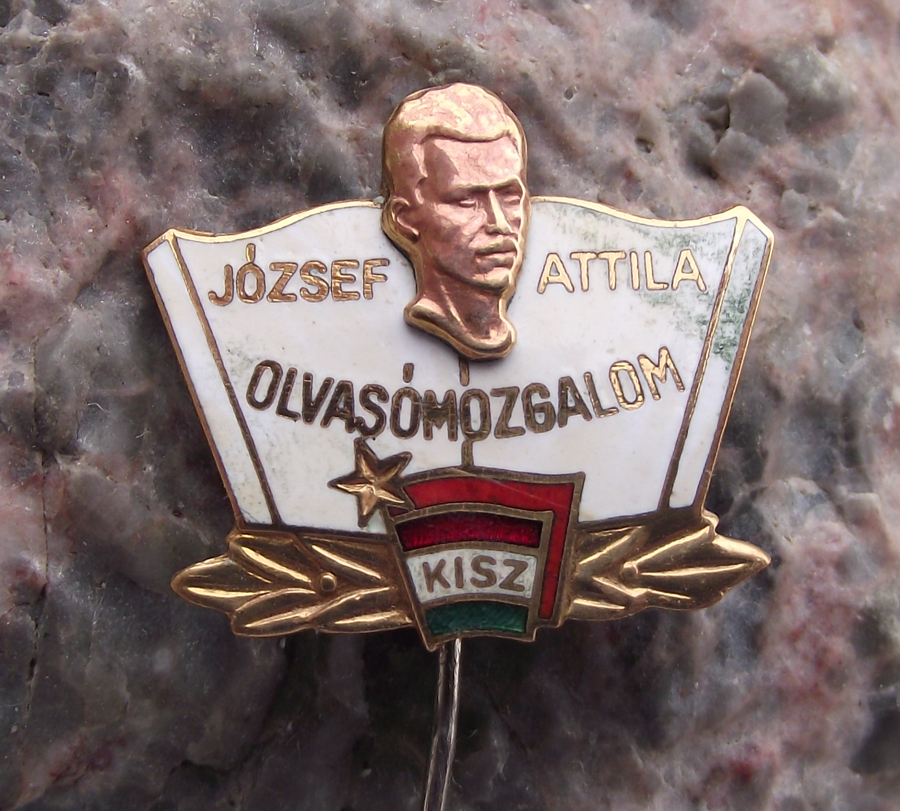 - The words József Attila olvasómozgalom refer to the 'reading movement' he inspired. The badge displays and open book emblem.