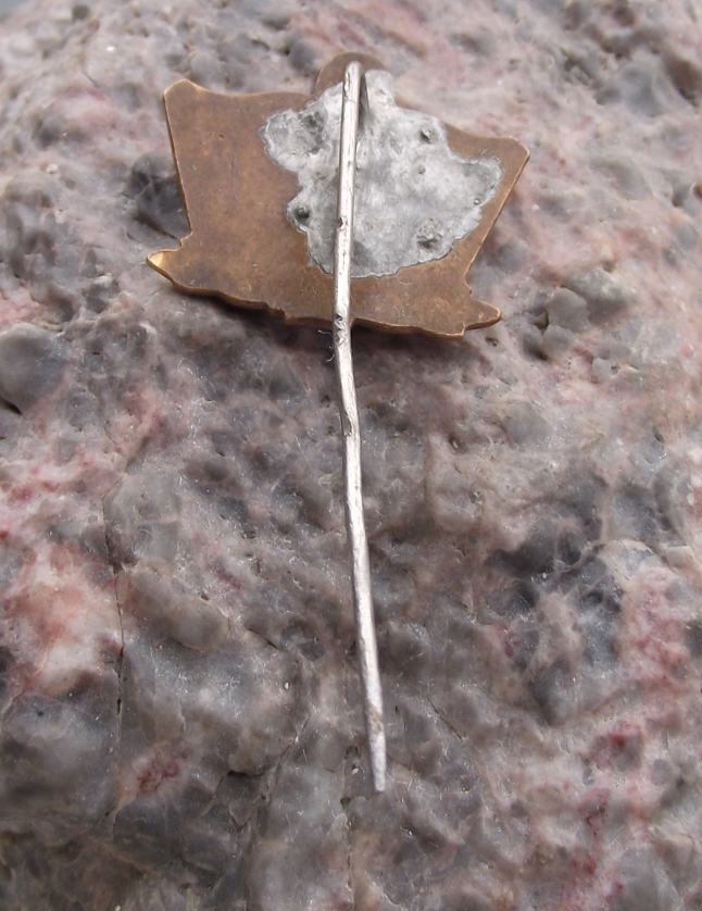 - A gold coloured metal pin badge 2.3cm in diameter with a long stick pin style pin fastener to the rear.