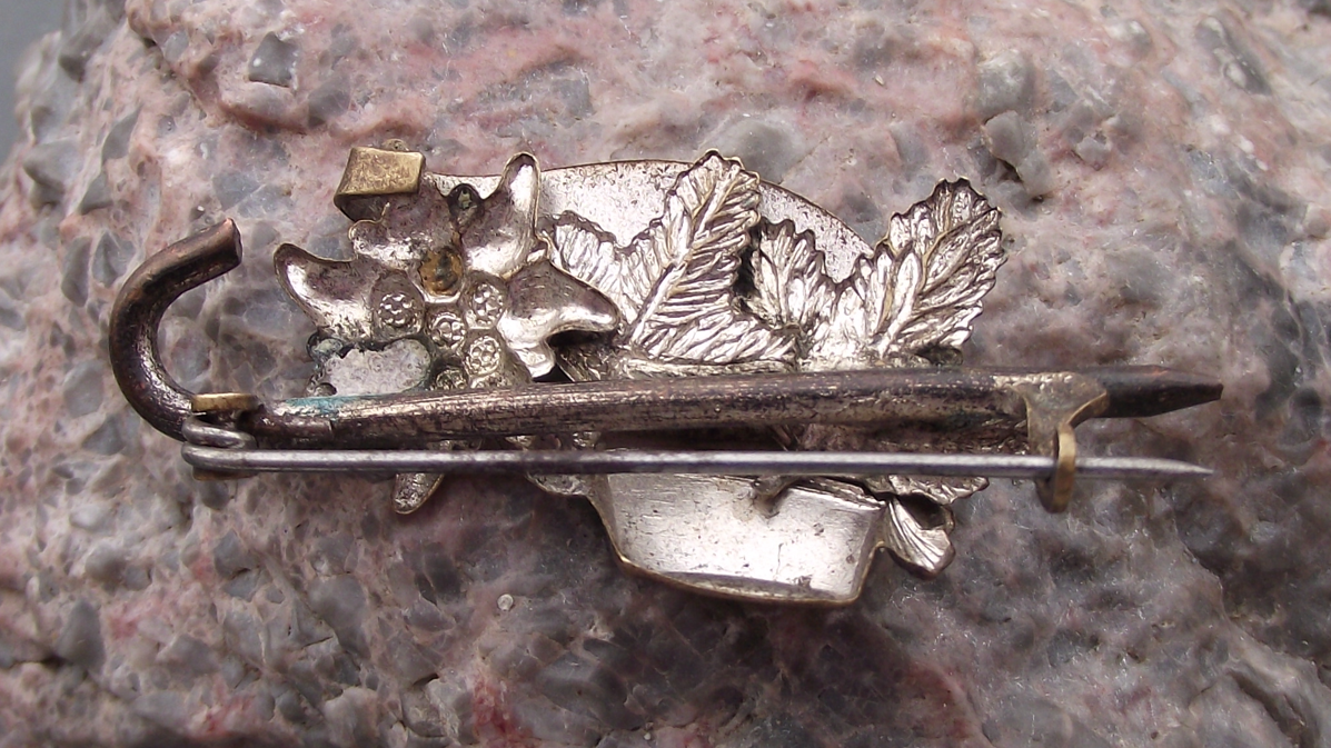 - A gold coloured metal hunting themed pin from Czechoslovakia. The badge face is 4.9cm wide and has a safety clasp style fastener. Featuring a hunter's cap and walking stick over a pine tree twig and edelweiss flower.