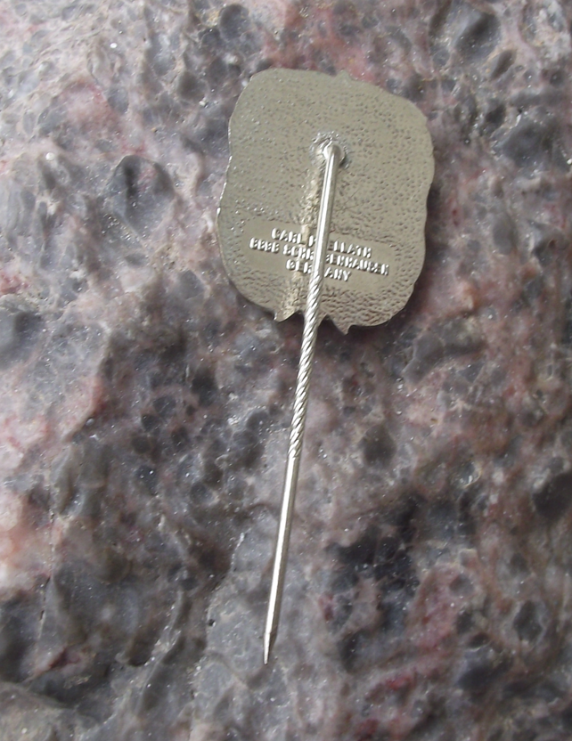 - A vintage gold coloured metal pin badge 2.2cm high with a long, stick pin style fastener to the rear.